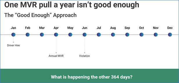 The problem with that approach is that it opens an extremely wide liability risk exposure gap of up to 364 days. If a driver receives a violation or suspension the day after the company pulls the MVR, they have a 364-day grace period before the infraction is discovered. That 364 days represents a lot of driving hours, and plenty of opportunities for that driver to have a traffic stop or be involved in an accident where the fleet could be liable.